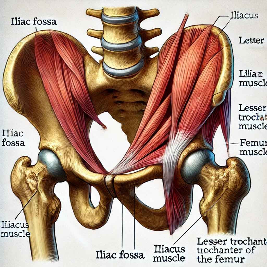 The iliacus muscle originates from the iliac fossa on the interior side of the hip bone and the ala of the sacrum. It inserts onto the lesser trochanter of the femur, combining with the tendon of the psoas major muscle. The iliacus is innervated by the femoral nerve (L2-L4) and receives blood supply from the iliolumbar artery.
